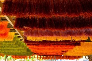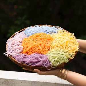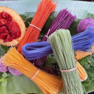 Each type of the five- color dried rice vermicelli has a unique color and different flavor. For example, yellow vermicelli is made from pumpkin or corn, red vermicelli is made from gac or beetroot, green vermicelli is made from moringa leaves, or blue vermicelli is made from butterfly pea flowers…